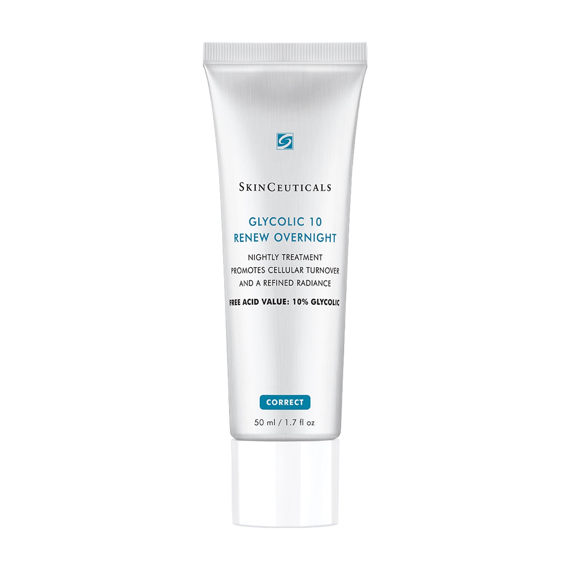 Nighttime corrective cream with 10% free acid glycolic promotes cellular turnover for improved skin clarity and brightness.